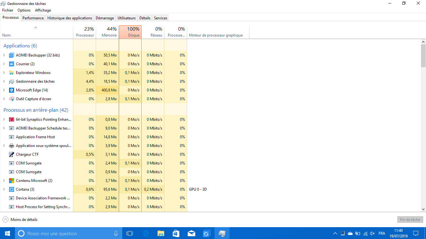 Un changement de disque dur pour un SSD récent sera toujours bénéfique à votre PC, néanmoins le symptôme le plus parlant est le pourcentage d’accès disque. Vous pouvez le voir en faisant ctrl + alt + suppr puis gestionnaire de tâche. Après, allez dans dans l’onglet processus : vous pouvez voir le taux d’utilisation du disque dur.