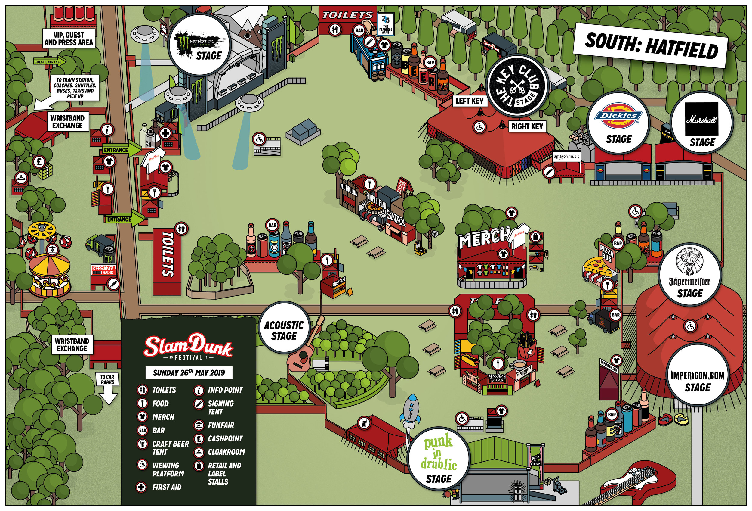 Hatfield est un petit village au nord de Londres (mais au sud de l’Angleterre, d’où l’édition South du Slam Dunk). Situé à environ 35 km de Londres, c’est sur le gigantesque parc naturel Hatfield Park que nous donnait rendez-vous le festival punk le plus connu d’Angleterre. Un lieu très grand et spacieux pour accueillir tous les festivaliers. D’ailleurs, chapeau bas à l’installation énorme de toutes les scènes et les stands de la part du Slam Dunk. Tant de logistique pour une douzaine d’heures de festival, c’est assez impressionnant, surtout qu’il a fallu installer tout en double pour l’édition North et South. Il y avait clairement l’infrastructure pour faire un festival de plusieurs jours, donc on regrette presque de ne pas pouvoir faire durer le plaisir plus longtemps !
